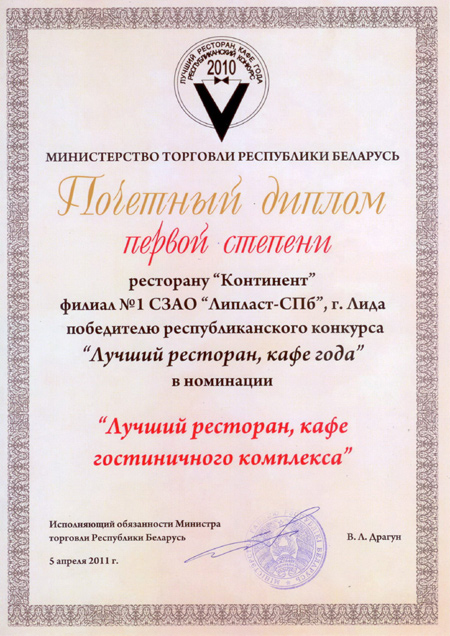 Ресторан «Континент», который находится в собственности нашего предприятия, вошел в номинацию «Лучший ресторан, кафе», удостоился диплома первой степени и признан лучшим рестораном гостиничного комплекса. В спектр услуг ресторана входит организация и проведение банкетов, фуршетов, семинаров, презентаций, бизнес-ланчей, юбилеев, свадеб и шоу-программ.