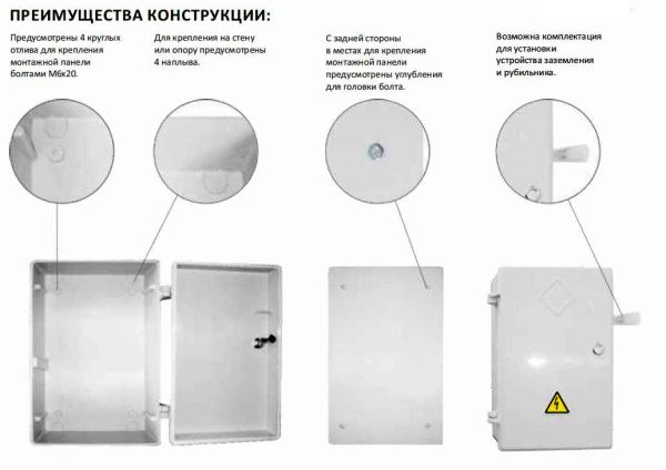 Базовая комплектация корпуса: монтажная панель, ключ стационарного замка, знак электрического напряжения.